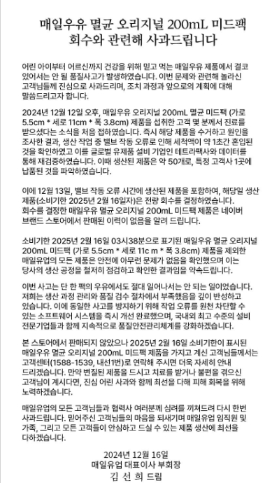 이번 사건은 2024년 12월 16일, 매일유업의 멸균우유 오리지널 200ml 제품에서