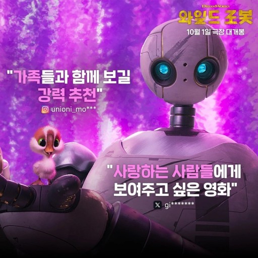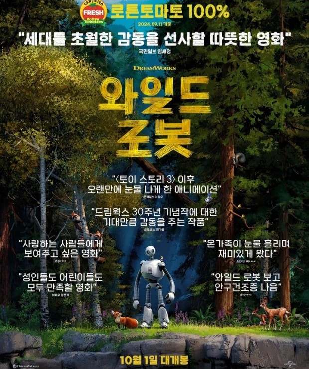 영화 와일드로봇은 애니메이션 장르로, 2024년 10월 1일에 개봉 했습니다.